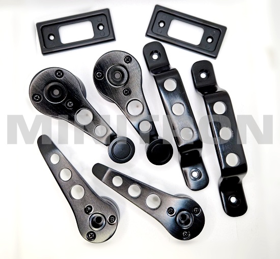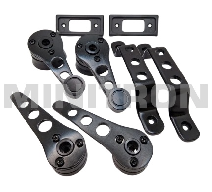 10-osainen alumiinikahvasarja noin vm. 1970-2000 Mineihin. Huom. Kiinnivetokahvan pulttiväli soveltuu noin vm. 1985-2000 Mineihin, jolloin vanhempiin oviin voit joutua tekemään kahvoille uudet reiät.