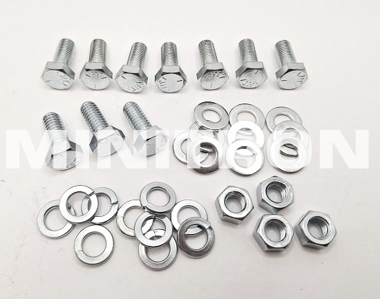 Täydellinen kiinnityssarja pultteja, muttereita ja aluslevyjä, jotka tarvitset kahden moottorin kumityynyn kiinnittämiseen etukelkkaan ja moottoriin.
